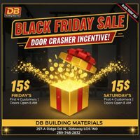 First 4 PURCHASING CUSTOMERS on Friday, Nov 28th AND the first 4 PURCHASING CUSTOMERS on Saturday, Nov 29th will each receive a $15 DB Building Materials Gift Card with a minimum purchase of $100 or more!